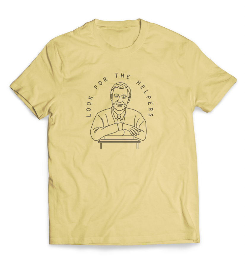 The “Look for the Helpers!” shirt features navy ink printed on a buttercream color shirt.