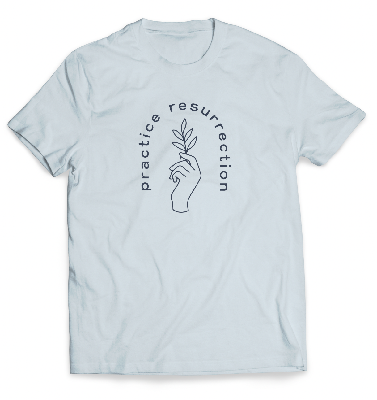 Inspired by a phrase from a Wendell Berry poem, the “Practice Resurrection” shirt features dark blue ink printed on a light blue.