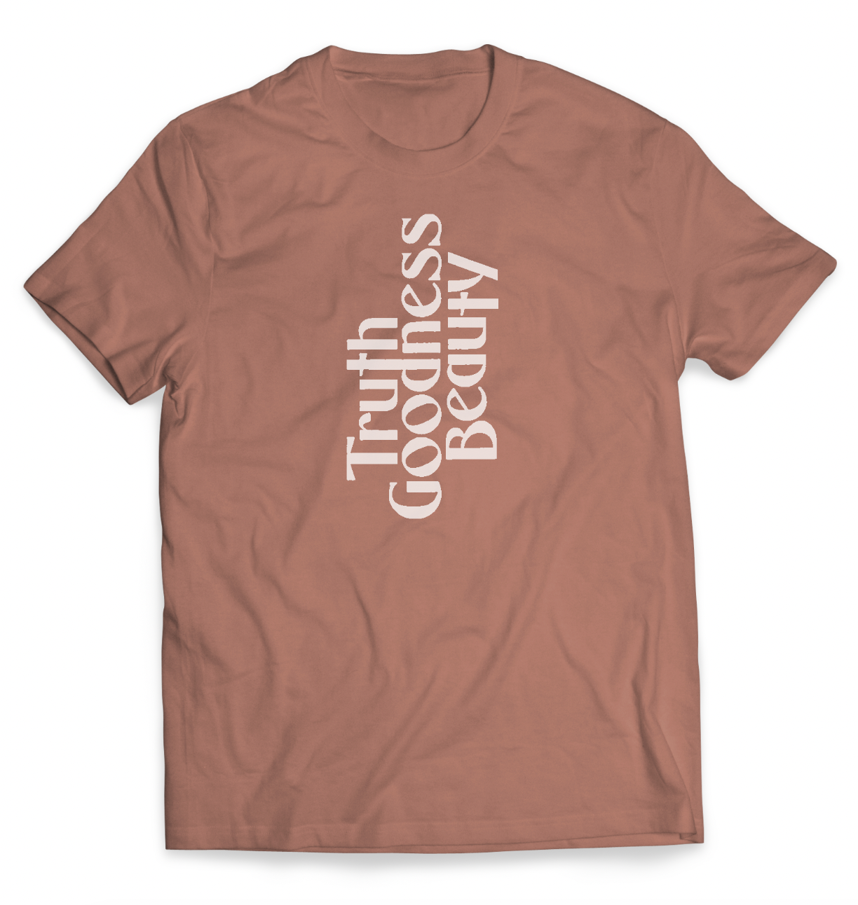 The “Transcendentals” shirt features white ink printed on a terracotta color shirt.